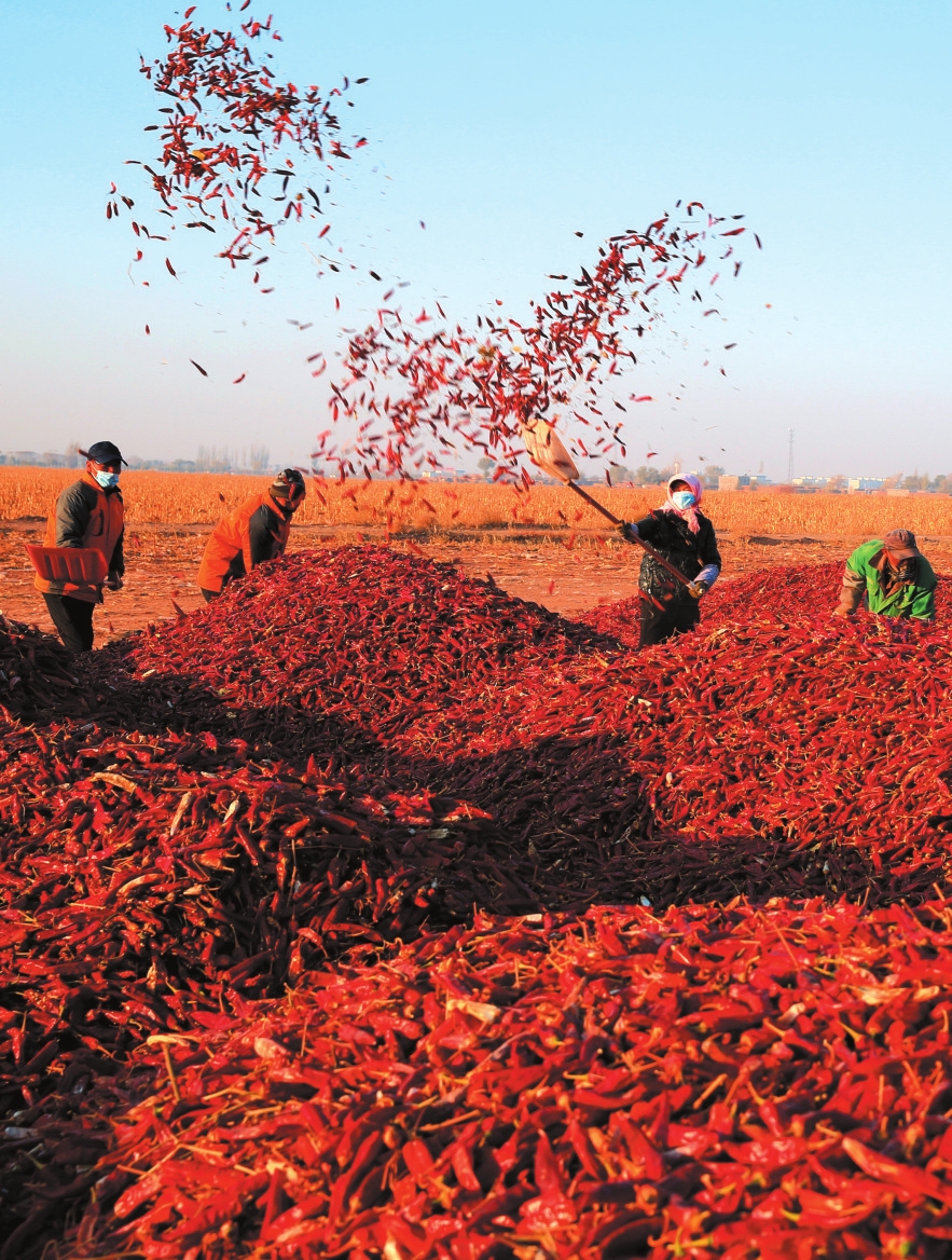 彼時(shí),農(nóng)家院落也成了豐收“展示廳”:屋檐下玉米辮與紅辣椒相映成趣,晾曬場上谷物、干果鋪展成金色“地毯”,地窖中土豆、白菜碼放整齊。