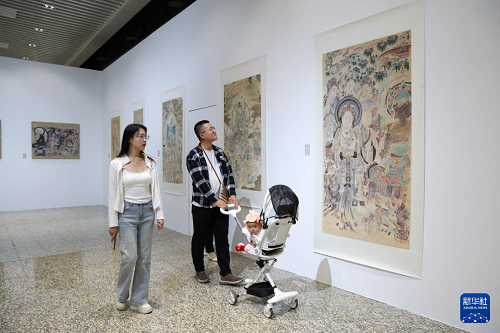 9月22日,游客在參觀敦煌研究院“典范”“高地”建設(shè)成果展。(新華社記者 郎兵兵 攝)