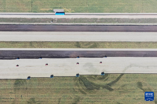 9月23日,在黑龍江北大荒農(nóng)業(yè)股份有限公司友誼分公司一旱田地塊,大型農(nóng)業(yè)機(jī)械在進(jìn)行大豆收獲作業(yè)(無人機(jī)照片)。(新華社記者 王松 攝)