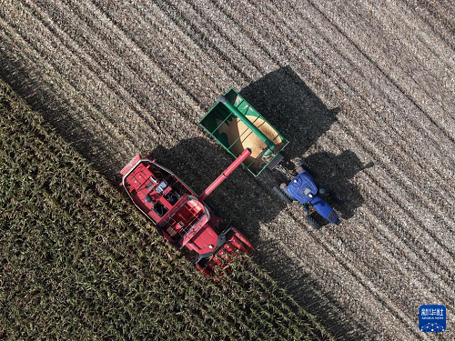 9月23日,在黑龍江北大荒農(nóng)業(yè)股份有限公司友誼分公司一旱田地塊,大型農(nóng)業(yè)機(jī)械在進(jìn)行玉米收獲作業(yè)。(新華社記者 王松 攝)
