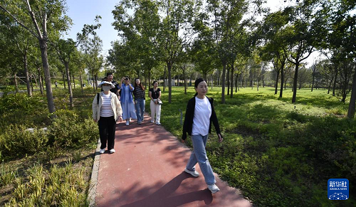 9月24日,市民在順義區(qū)后沙峪鎮(zhèn)的溫榆河公園內(nèi)的步道上運動。(新華社記者 李欣 攝)