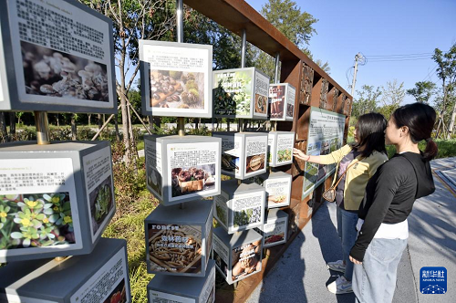 9月24日,市民在順義區(qū)后沙峪鎮(zhèn)的一處林間小型公園內(nèi)觀看中藥材科普畫廊。(新華社記者 李欣 攝)