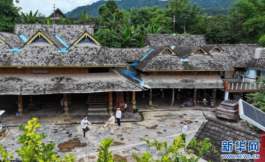 8月16日,波罕丙帶領(lǐng)徒弟們練習(xí)傣族武術(shù)(無人機照片)。新華網(wǎng)發(fā)(李云生 攝)