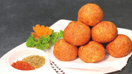 豆腐丸子精選五臺(tái)山鹵水豆腐,擠出多余水分,壓成細(xì)膩豆腐碎,加入佐料攪拌,揉成圓潤(rùn)緊實(shí)的丸子,蒸制后在麥芽糖水中定型再開炸,外衣漸鍍“金甲”,內(nèi)里卻保持著豆腐的柔嫩本味。