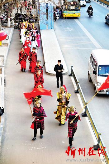 男的身披戰(zhàn)袍鎧甲,女的一襲古裝長裙,一支戰(zhàn)國時代的隊伍揮舞旗幟、佩帶長劍從忻州城區(qū)七一路走過?!笆遣皇桥碾娨晞×耍俊边^往行人紛紛側目觀望。