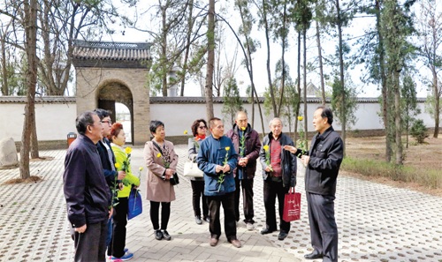社員一行首先向元好問銅像敬獻(xiàn)花籃,隨后來到元墓,將帶來的黃菊擺放碑前,肅立鞠躬。遺山詩社社員、元好問民間傳說非遺傳承人李謙和為大家講解了元遺山的生平經(jīng)歷、文學(xué)成就、逸聞趣事,以及陵園的布置和對聯(lián)賞析。