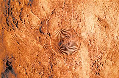 南澳大利亞尼佩納·埃迪卡拉國(guó)家公園砂巖中的埃迪卡拉紀(jì)化石狄更遜水母(中)與較小的錨形帕文柯利納蟲(左)的圖像。圖片來(lái)源:斯科特·埃文斯