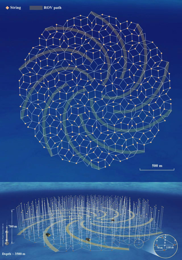 根據(jù)設(shè)計(jì),這些線纜像巨型海藻一樣垂直地錨定于海床上,每根長(zhǎng)約700米,互相間距70米至110米。每根線纜搭載約20個(gè)光學(xué)探測(cè)球艙,如同深海中的一串串鈴鐺,靜待高能中微子的到來(lái)。