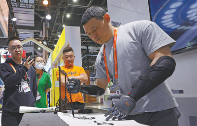 中國品牌博覽會(huì)上,工作人員用腦機(jī)科技操控的假肢寫毛筆字。新華社記者 方 喆攝