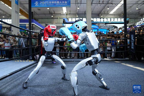 在2025世界機器人大會展館內,觀眾在宇樹機器人展臺觀看機器人拳擊展示(8月11日攝)。新華社記者 鞠煥宗 攝