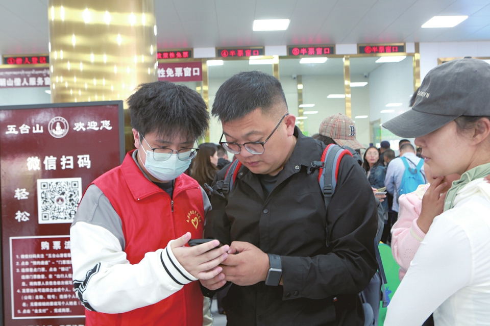 五臺山游客服務中心大廳內,志愿者正在協(xié)助游客網上購票。李春澤攝