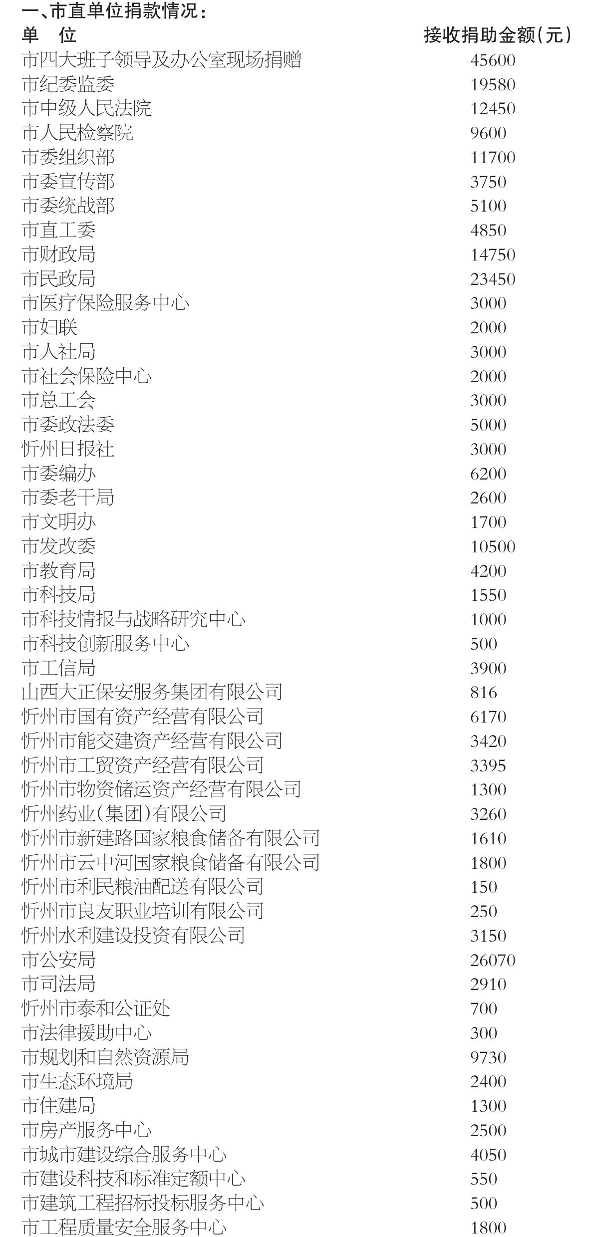 2024年11月22日,市委、市政府辦公室發(fā)出《關于開展“送溫暖、獻愛心”社會捐助活動的通知》,市四大班子領導和機關干部率先垂范,各縣(市、區(qū))、各單位高度重視,認真組織,廣大干部職工積極響應,“送溫暖、獻愛心”社會捐助活動有效開展。截至2025年4月底,市直140個單位組織干部職工參與捐助,共捐款766388元,各縣(市、區(qū))接收捐款338.09萬元,合計捐款4147288元,為解決全市人民群眾的生產(chǎn)生活問題起到了積極作用?,F(xiàn)將捐助情況公告如下(市直單位以捐助時間先后為序):