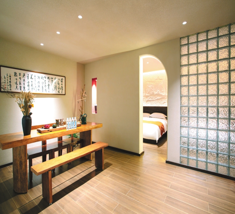 牧瑤溫泉民宿位于忻府區(qū)南關(guān)村。走進(jìn)院內(nèi),大片玻璃窗通透明亮,門前蒼松與其他綠植讓人心曠神怡,潺潺流水和中式亭子的造景,增添了許多的靈動韻味。