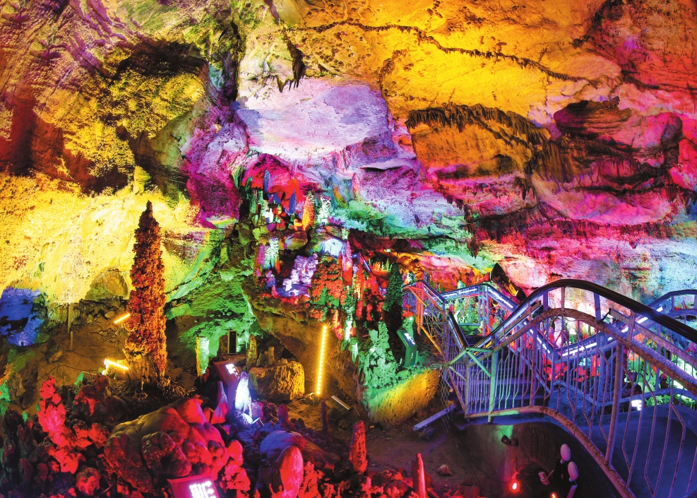 游客沿著精心設計的路線,可觀賞50多個景點。其中“群獅迎賓”,洞口一組石筍形似雄獅列隊,栩栩如生;“金龜出洞”,巨石形成的龜狀奇石,仿佛正探秘人間;“瑤池仙境”與“蓬萊仙島”,燈光下的石幔如天宮云霞;“鎮(zhèn)海寶塔”,高1.8米的花團狀石塔,景象奇麗。最令人驚嘆的是洞內(nèi)的“冰瀑世界”。在水晶洞和一線天區(qū)域,巖溶從洞頂傾瀉而下,形成各種瀑布奇觀:有如長白山瀑布的白練懸空,有如黃果樹瀑布的氣勢恢宏,還有黃巖大瀑布的玲瓏剔透。一處名為“禹王觀瀑”的景點,更讓游人仿佛看見大禹治水時三過家門而不入的身影。