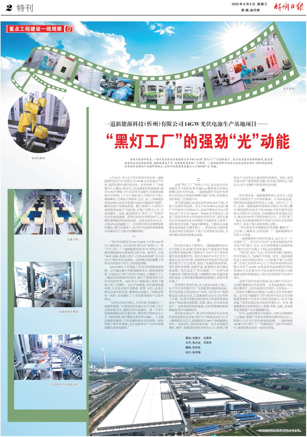 6月24日,步入位于忻州經(jīng)濟(jì)開(kāi)發(fā)區(qū)的一道新能源科技(忻州)有限公司14GW光伏電池生產(chǎn)車間,強(qiáng)烈的現(xiàn)代感撲面而來(lái)。沒(méi)有傳統(tǒng)工廠的喧囂與人頭攢動(dòng),取而代之的是精密的機(jī)械韻律:數(shù)百臺(tái)AGV智能小車(自動(dòng)導(dǎo)引運(yùn)輸車)沿著預(yù)設(shè)路線無(wú)聲穿梭;上千臺(tái)六軸機(jī)器人手臂在生產(chǎn)線上精準(zhǔn)舞動(dòng),完成硅片的抓取、定位、加工;高精度的在線AOI(自動(dòng)光學(xué)檢測(cè))設(shè)備如同敏銳的“眼睛”,瞬間完成產(chǎn)品瑕疵篩查。整個(gè)流程中,從原料開(kāi)盒到高效電池片下線包裝,實(shí)現(xiàn)了全程無(wú)人化、自動(dòng)化操作。這里,就是被譽(yù)為“黑燈工廠”的現(xiàn)代化光伏制造基地。即使在夜間無(wú)照明條件下,也能依靠智能系統(tǒng)高效運(yùn)轉(zhuǎn)。這座總投資60億元、占地474畝的超級(jí)工廠,歷經(jīng)兩年多時(shí)間緊鑼密鼓的建設(shè),現(xiàn)已全面投產(chǎn),成為忻州這座傳統(tǒng)能源城市向新質(zhì)生產(chǎn)力躍升的耀眼地標(biāo)。